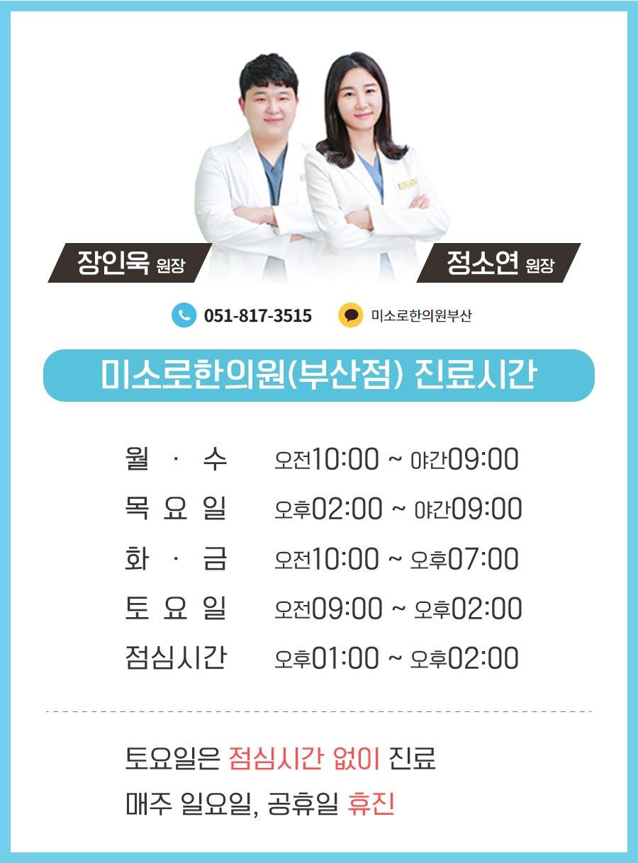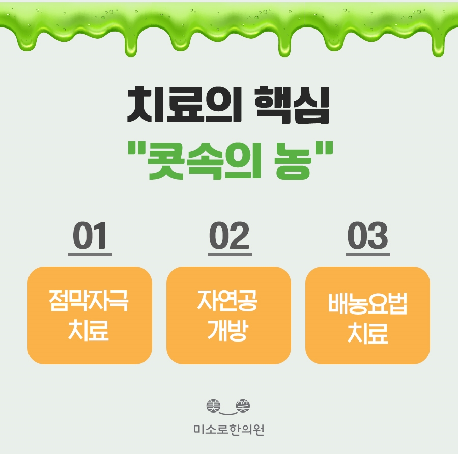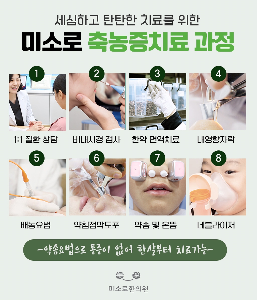 부산축농증한의원의 치료에서는 병증에 대한 케어를 위해 1:1 면밀한 진료 및 검진으로 환부의 상태를 파악하여 약침, 점막재생치유, 배농요법을 통해 보다 빠르게 회복할 수 있도록 안내하였습니다.