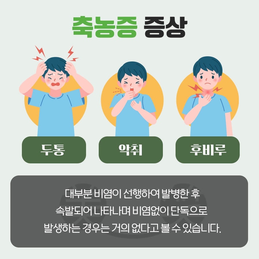 심한 경우 안면부에서 압통 및 두통을 동반하기도 하며 누적된 고름이 코로 흘러내리지 않고 목 뒤로 흘러내려 이를 토해내면 노란색 또는 초록색이 되기도 합니다.