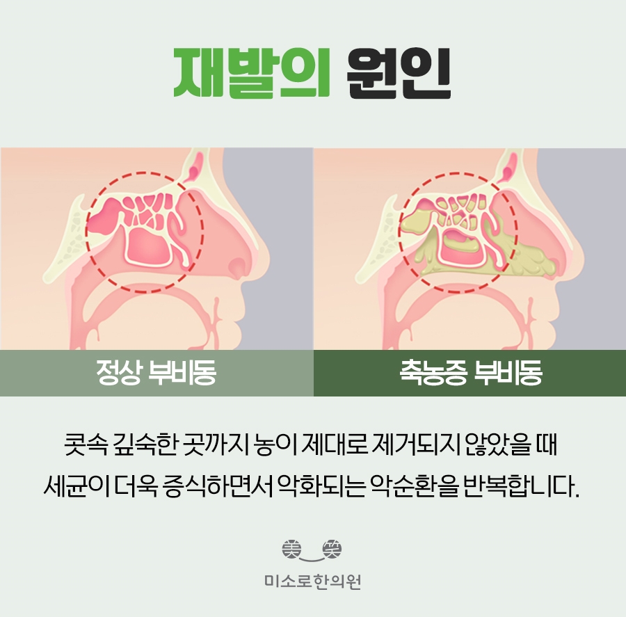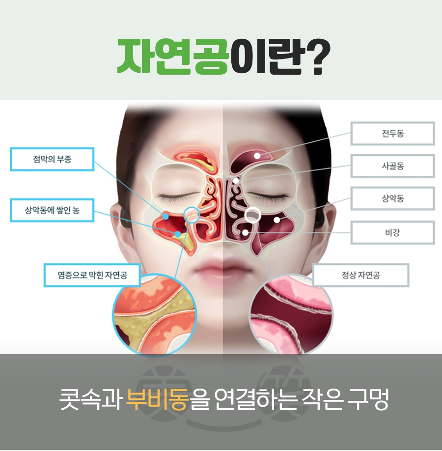부비강 내에서 발생하는 염증이 시간이 지남에 따라 점차 심해지고 고름이 쌓이게 되는데 이는 자연공에서 코로 나오게 되는데 이때 두통이나 압통, 결막염이나 중이염 등을 초래하게 됩니다.
