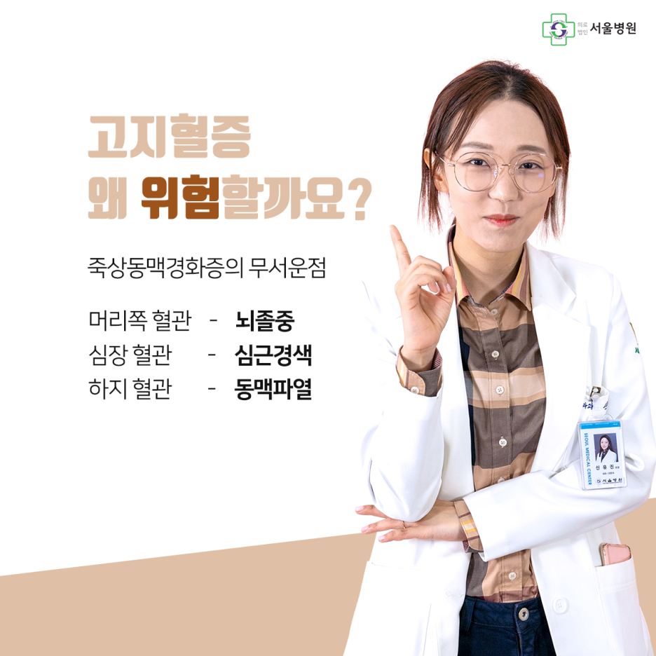 고지혈증이 왜 위험하지?혈관이 있으면 내막이라는 게 있어요.콜레스테롤이 피와 내막에 쌓입니다.이것이 죽상 동맥 경화증으로 바뀌어서 혈관이 굳어지고 내막이 좁아지게 됩니다.이러한 증상이 머리에 생겨 머리쪽 혈관이 막히면 뇌졸중이, 심장에서 막히면 심근경색이, 다리로 막히면 동맥파열 등의 증상으로 악화될 수 있습니다.간단하게 여드름으로 비교해요피부에 생기면 여드름이 나지만, 죽상 동맥 경화증은 혈관에 생기는 여드름이라고 생각해 주세요.이제 여드름이 밖으로 나오면 그것으로 끝이지만, 혈관 안이 좁기 때문에 혈관에서 터지면 혈관을 막아 버리기 때문에 위험합니다.