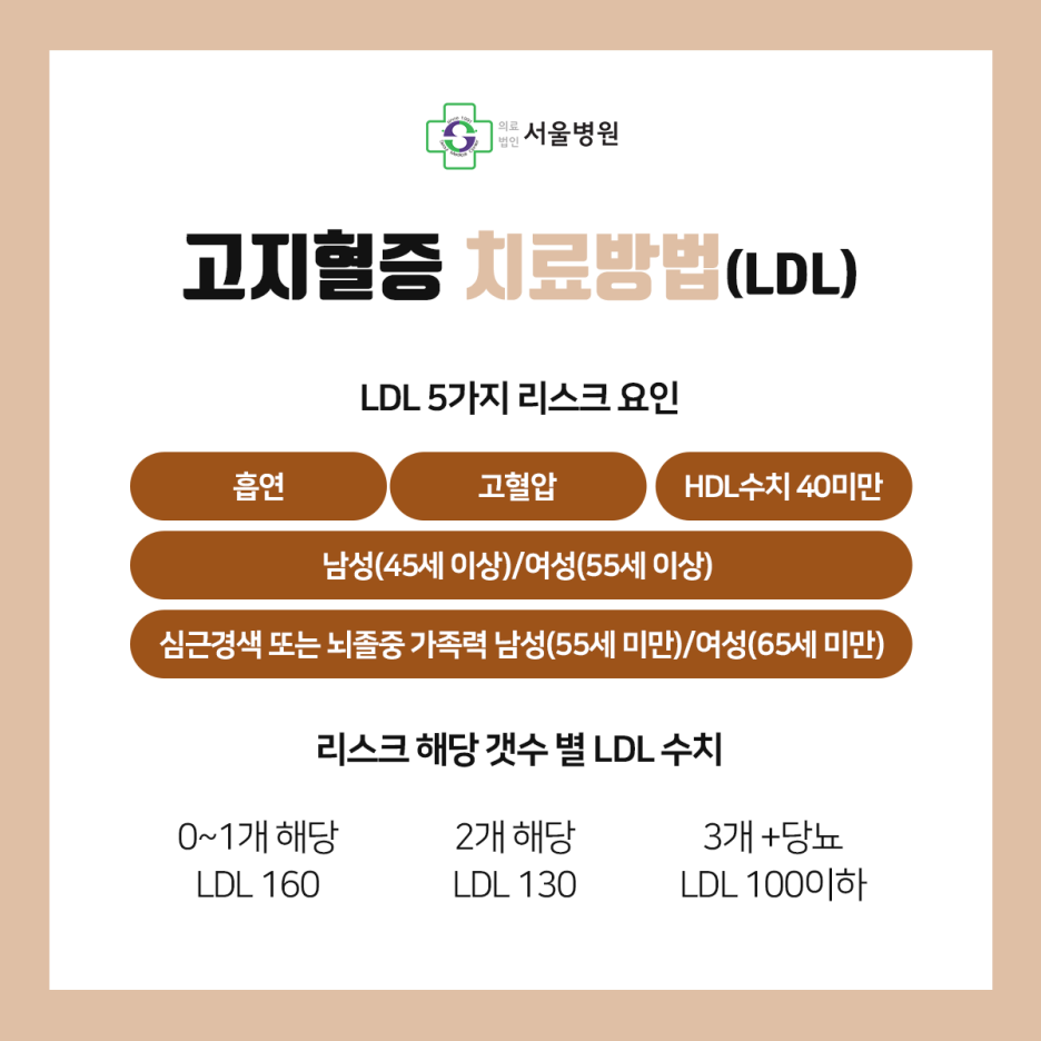 고지혈증 치료(LDL) LDL은 다섯 가지 위험 요인을 확인할 수 있습니다.첫째, 흡연 여부 둘째, 고혈압 여부 셋째, HDL(좋은 콜레스테롤) 수치가 40 미만 넷째, 45세 이상 남성/55세 이상 여성 다섯째, 심근경색 또는 뇌졸중 가족력이 있는 55세 미만 남성 또는 65세 미만 여성
