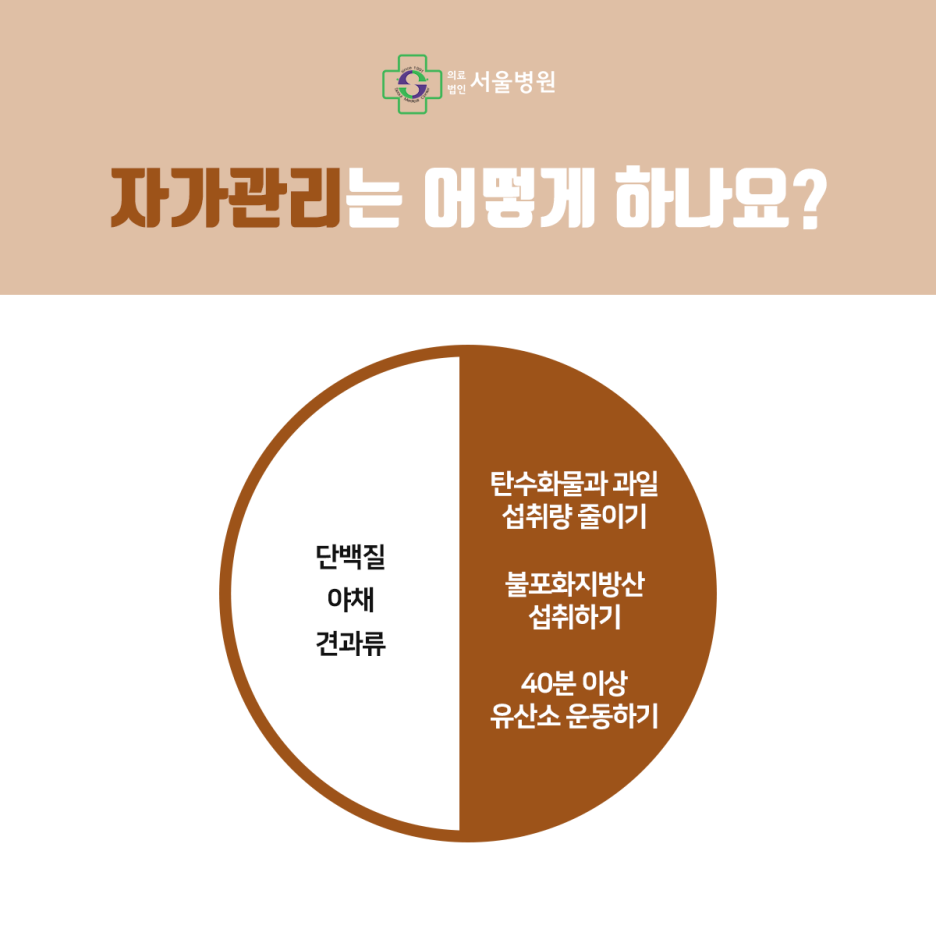 자기관리는 어떻게 해야 할까요?섭취량을 줄일 것을 가장 권장하는 좋은 방법입니다.하루 먹는 것을 원이라고 생각했을 때 절반 정도는 단백질, 견과류, 야채 중심으로 먹고 빵과 떡, 쌀, 국수 등의 탄수화물은 가능한 한 줄이는 것이 좋아요.그리고 과일이 건강에 좋다고 알려져 있는데, 모두 콜레스테롤로 옮겨지기 때문에 과일의 섭취도 줄이는 것이 좋아요.또한 지방산 중 나쁜 지방은 피해야 하며, 건강한 지방인 불포화 지방산 등 등푸른 생선이나 오메가3 등이 도움이 됩니다.다이어트를 하기 위해서는 유산소 운동을 하는 것이 좋습니다.유산소 운동은 초반에 혈중에 있는 글루코스를 사용하고 그 다음은 지방을 태우기 시작하는 시점인 40~120분 이후이므로 땀이 약간 날 정도로 오랜 시간 운동을 하는 것이 좋습니다.