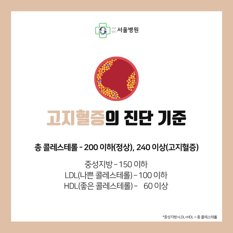 고지혈증의 진단 기준은 고지혈증으로 총 콜레스테롤은 중성지방과 나쁜 콜레스테롤로 불리는 LDL, 좋은 콜레스테롤이라는 HDL입니다.이렇게 나온 총 콜레스테롤은 200 이하를 정상, 240 이상을 고지혈증으로 진단하고 있습니다.LDL(나쁜 콜레스테롤)은 100 이하로 조절하는 것이 좋고 중성지방은 150 이하, HDL(좋은 콜레스테롤)은 60 이상 나오는 것을 정상 수치로 보고 있습니다.