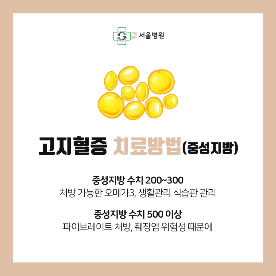 고지혈증 치료(중성지방) 송파역 내과 서울병원은 중성지방이 높은지 LDL이 높은지에 따라 고지혈증 치료의 방향이 조금씩 달라집니다.중성 지방의 경우, 먹는 것에 많은 영향을 받습니다.예를 들어 고지혈증이 없는 경우, 과식이나 폭식의 경우 다음날이 되면 바로 수치가 오르고 식단 조절을 하면 또 수치가 떨어집니다.중성 지방의 수치가 500 이상 높으면 췌장염의 위험성 때문에 파이브레이트라는 약을 처방합니다.그러나 200300 정도의 수치라면 오메가3 제제와 같은 보조제나 처방으로 나오는 오메가3를 복용하면서 생활관리나 식습관 관리를 하면 약 1, 2개월 후 거의 100 이하로 떨어진 수치를 확인할 수 있습니다.