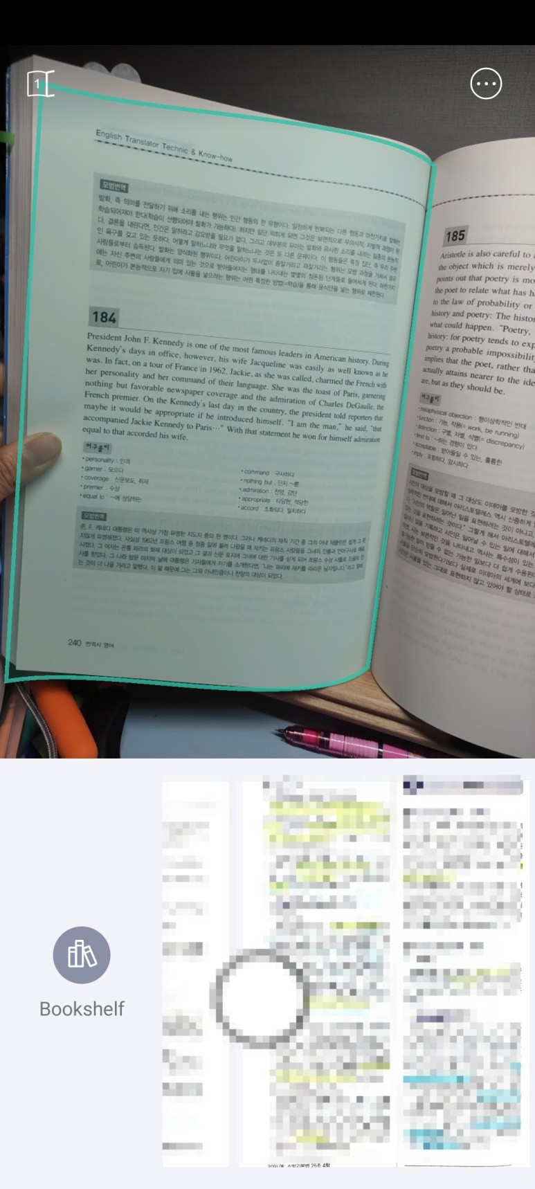 이렇게 앱을 설치하고 구동시킨 후 책을 펼쳐 놓으면 자동으로 한 페이지를 인식하게 됩니다.그리고 촬영을 누르면 바로 인식한 페이지를 자동으로 잘라 보기 쉽게 해줍니다.시간도 거의 걸리지 않고 순식간에 이 모든 과정이 완성됩니다.