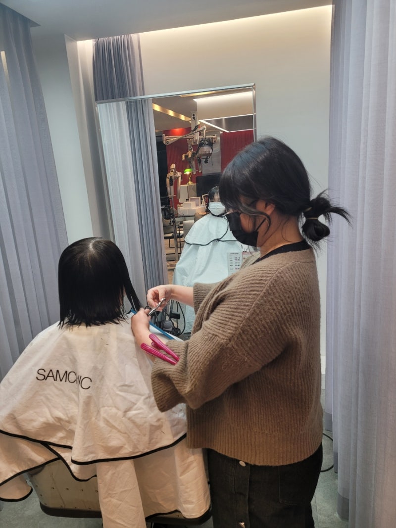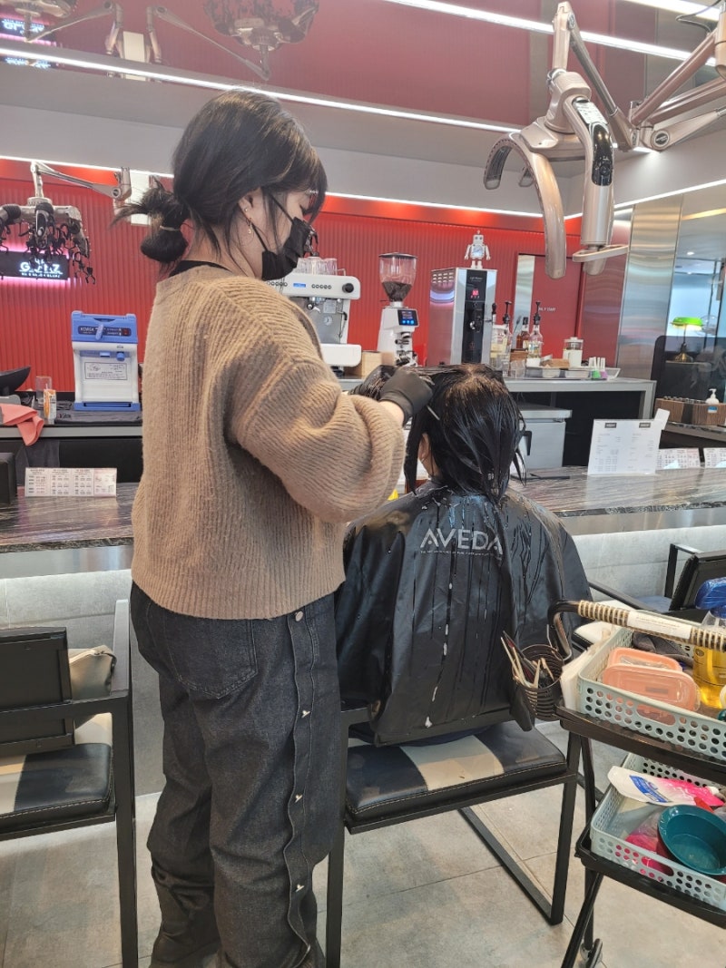 사전에 네이버 예약을 통해 예약한 채이안 디자이너와 잠시 상담 중~지금까지 미용실을 다니면서 이렇게 꼼꼼하게 헤어에 관해 상담해주는 곳은 처음이었습니다.그동안 머리가 많이 상했다고 클리닉을 추천해주셨는데 지금 당장 헤어스타일을 볼륨매직으로 예쁘게 해야 한다고 했더니 머리를 하면서 가끔 영양제 같은 걸 많이 발라주셨어요~