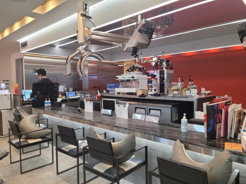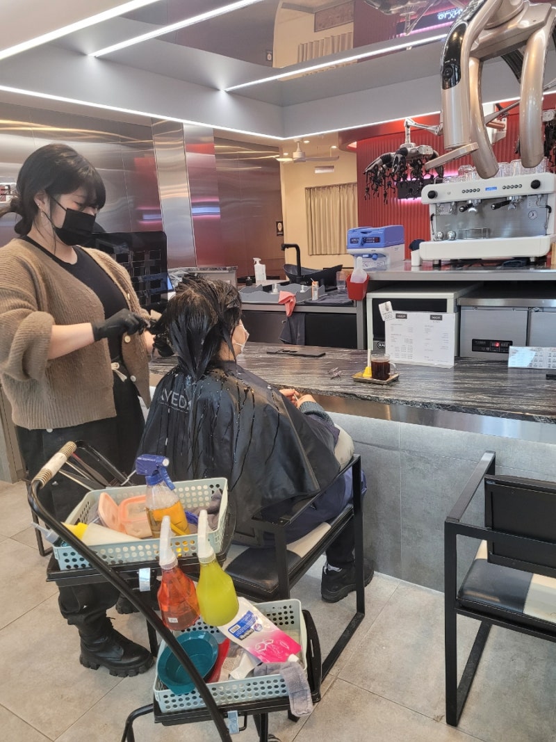 오~ 화상통화 미용실이 밖에서 봤던 풍경과 많이 달라요.가운데 커피머신이 있어서 그런지 카페 같기도 하고 좌석이 사적으로 되어 있는 것 같더라고요.