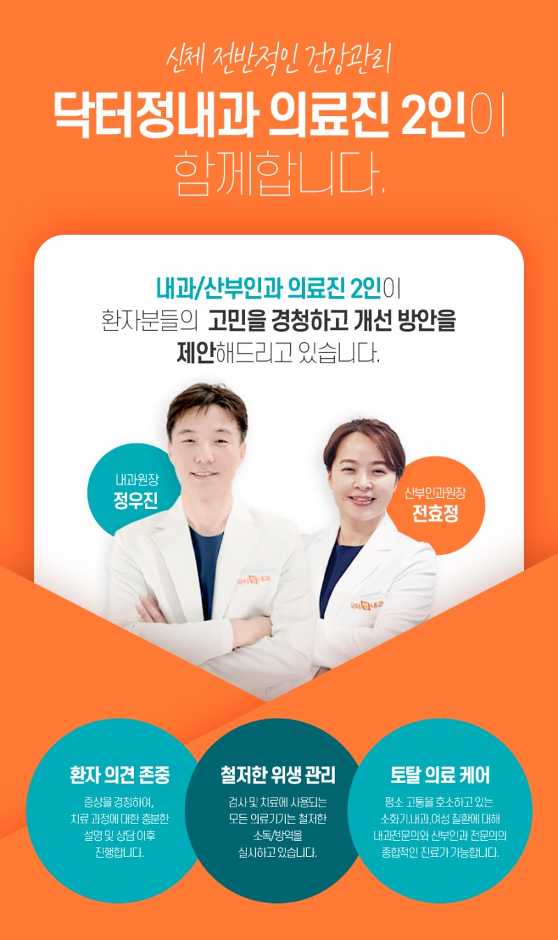 | 여성산부인과 전문의의 세심한 진료까지 받을 수 있는 곳, 저희 #닥터 정내과는 내과 전문의와 함께 15년 경력 이상의 산부인과 전문의가 상주하며 2인 진료로 운영되고 있는 의료기관입니다. 그에 따라 여성의 경우 천안건강검진에서 확인된 병변에 대해 산부인과를 별도로 방문하여 검사를 진행하는 복잡한 절차 없이 여기서 검사부터 치료까지 1step 과정으로 모든 과정을 진행할 수 있습니다.여의사 전문의의 섬세한 상담과 병력 촉진을 바탕으로 환자 개인별 특성에 따라 1:1 맞춤 치료를 통해 여성의 삶의 질을 저하시키는 각종 여성질환을 개선할 수 있도록 돕고 있습니다.