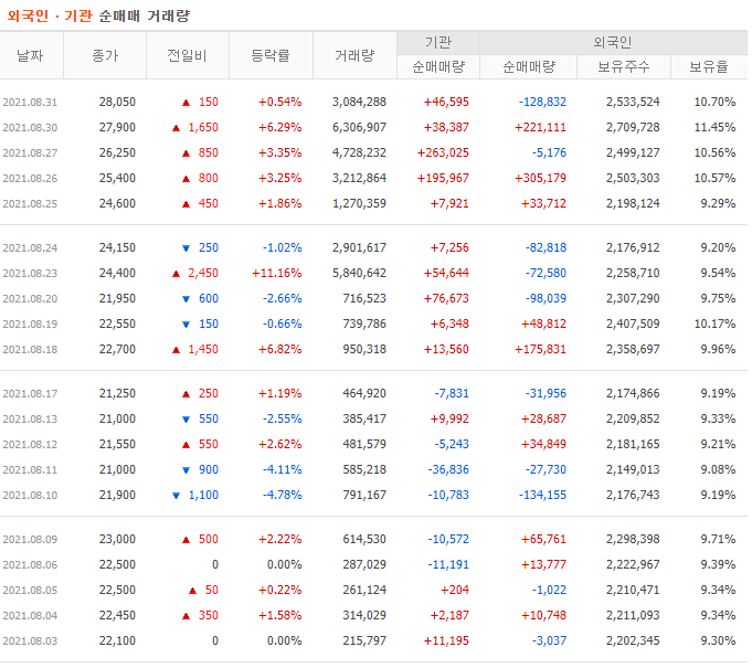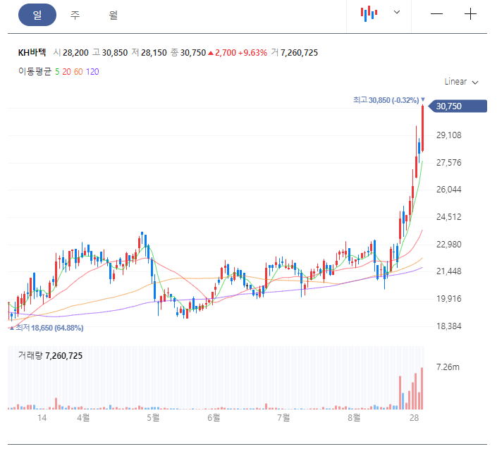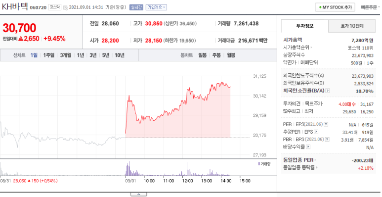 현재 주가를 보면, 오늘(9/1) 9.45%상승한 30,700원에 거래되고 있다.