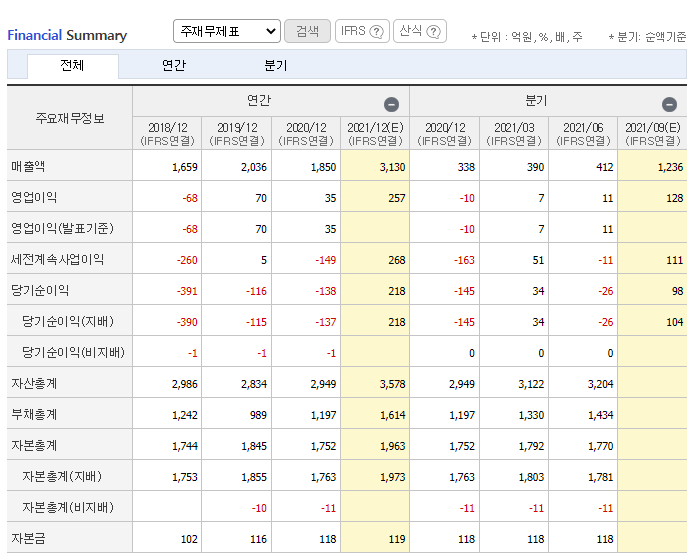 네이버 재무를 살펴본 결과 2021년 컨센서스는 영업이익이 전년 대비 큰 폭으로 상승할 것으로 예상되는 상황이라 현재 고점은 크게 의미가 없는 상황으로 보인다.